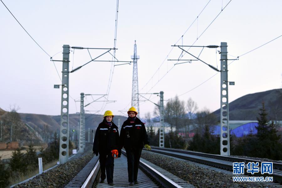 2月2日,在青藏鐵路公司西寧供電段哈爾蓋工區(qū)負(fù)責(zé)鐵路線上,郭勝強(qiáng)(左)與羅露露在巡檢接觸網(wǎng)。新華社記者 張龍 攝