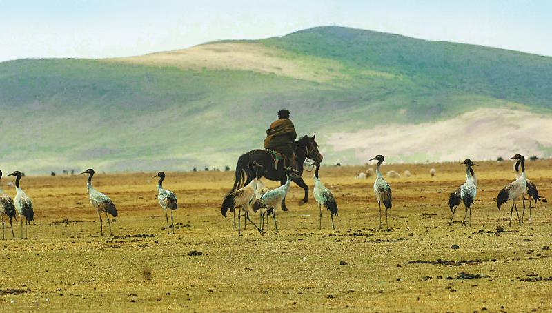 3月6日,今年的第一批黑頸鶴比往年提早了半個(gè)月飛回若爾蓋濕地,大草原上呈現(xiàn)出人與珍稀鳥類和諧共處的溫馨畫面。尹鋼 攝