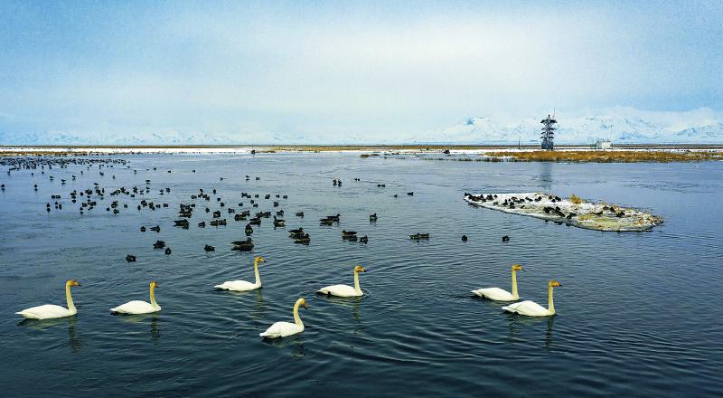 3月6日,若爾蓋濕地國家級自然保護(hù)區(qū)在花湖設(shè)立的高科技無人觀測塔(右后)正全天候觀察濕地鳥類的活動。尹鋼 攝