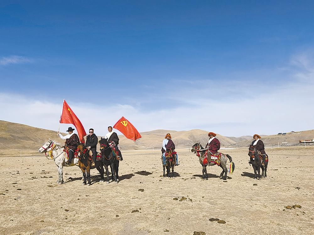 在玉樹藏族自治州曲麻萊縣葉格鄉(xiāng)龍麻村,一陣馬蹄聲由遠(yuǎn)而近,牧民江措趕忙放下手中的活從帳篷里探出頭來,定睛一看,幾個(gè)熟悉的身影進(jìn)入視線。走在最前面的干部手拿一面鮮紅的黨旗隨風(fēng)飄動(dòng),江措激動(dòng)地向大家打起了招呼。