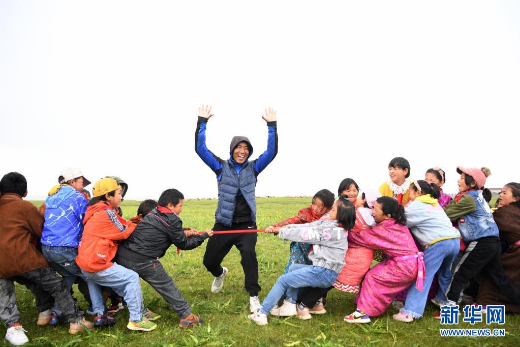7月14日,河曲馬場小學(xué)老師道布旦(中)在草原上組織孩子們拔河。新華社記者 陳斌 攝