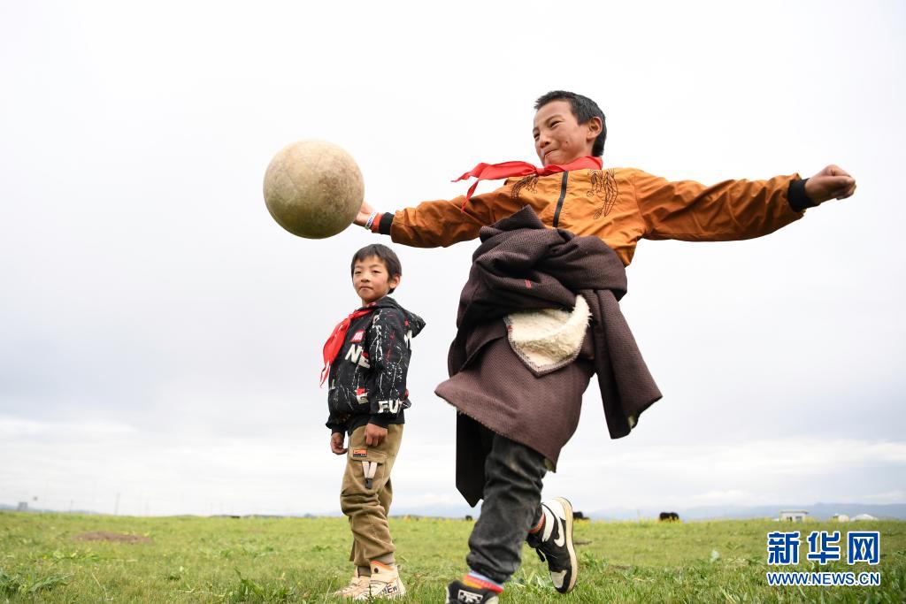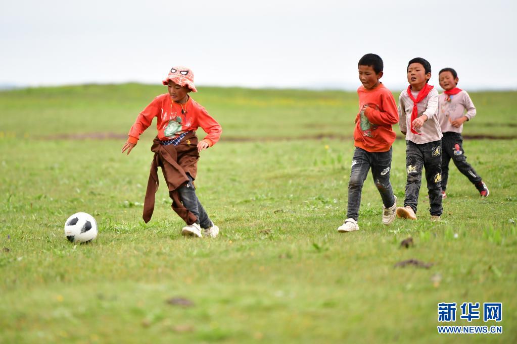 7月14日,河曲馬場小學(xué)學(xué)生參交羅布藏(右)和同伴在草原上踢足球。新華社記者 陳斌 攝