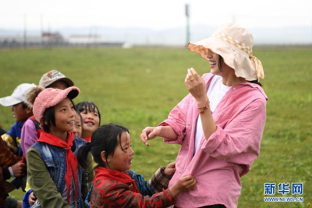 7月14日,河曲馬場小學(xué)老師余妙妍(右一)在草原上和孩子們做游戲。新華社記者 陳斌 攝