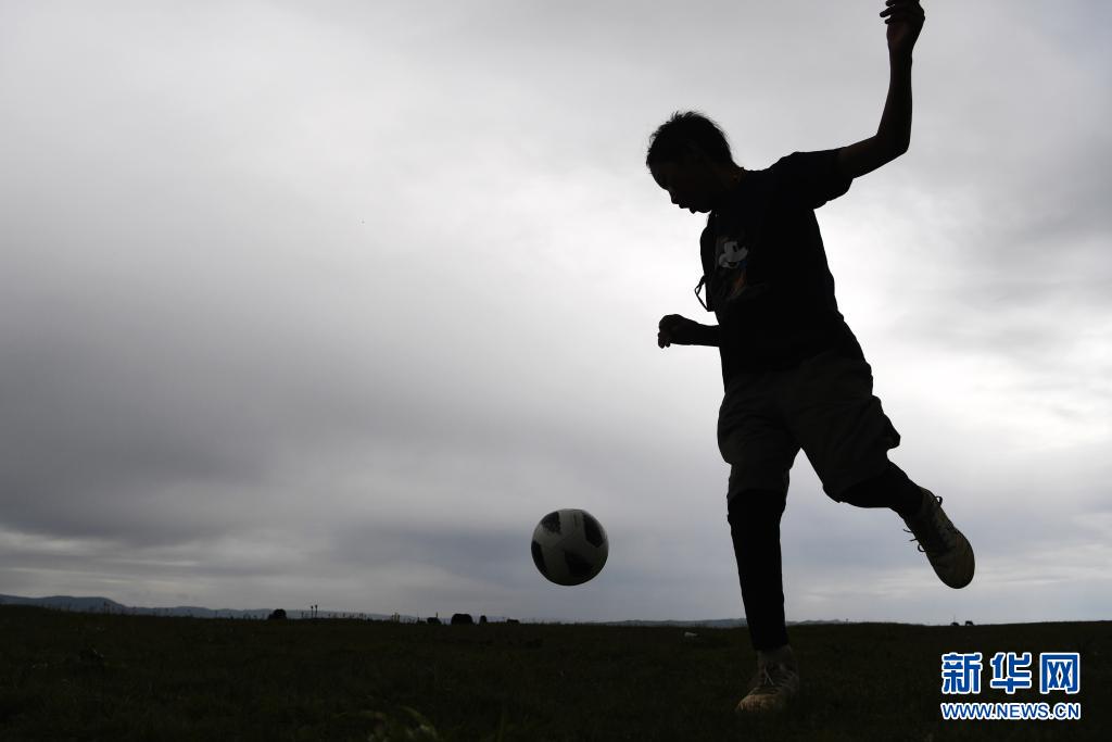 7月14日,河曲馬場小學(xué)學(xué)生丹增喇巴在草原上踢足球。新華社記者 陳斌 攝
