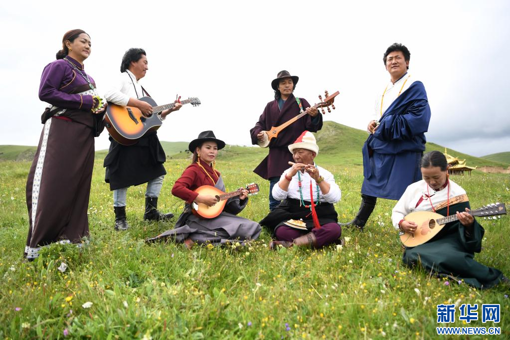 薩爾彈唱藝人尕藏扎西(中)和同伴在瑪曲草原上彈唱格薩爾(7月14日攝)。新華社記者 陳斌 攝