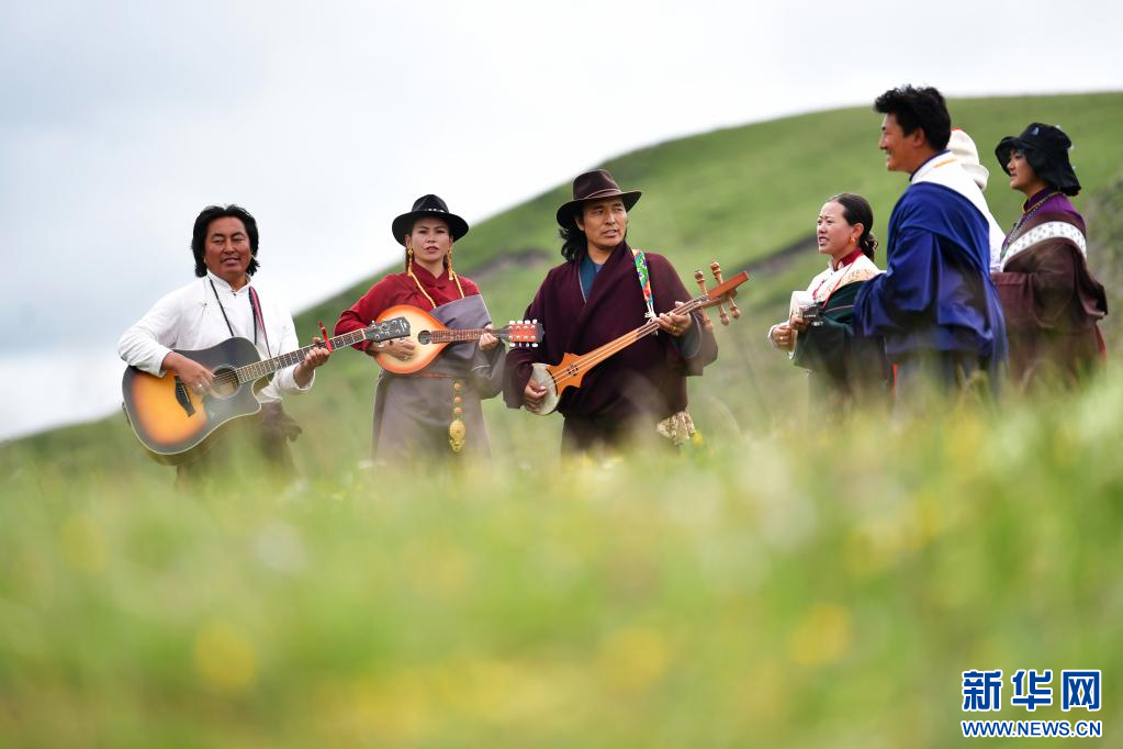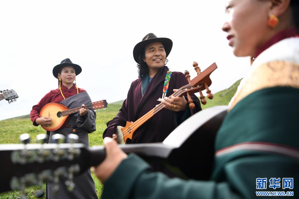 格薩爾彈唱藝人尕藏扎西(中)和同伴在瑪曲草原上彈唱格薩爾(7月14日攝)。新華社記者 杜哲宇 攝