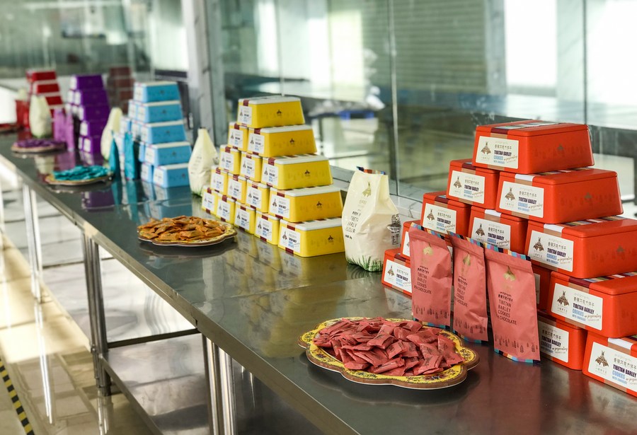 圖為甘孜縣格薩爾青稞文化園區(qū)研發(fā)生產(chǎn)的各種青稞產(chǎn)品。新華社記者 王曦 攝