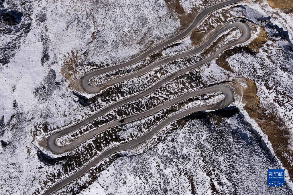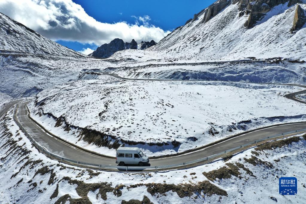 10月23日,一輛汽車(chē)行駛在四川省甘孜藏族自治州巴塘縣境內(nèi)的藏巴拉雪山的公路上(無(wú)人機(jī)照片)。新華社記者 劉坤 攝