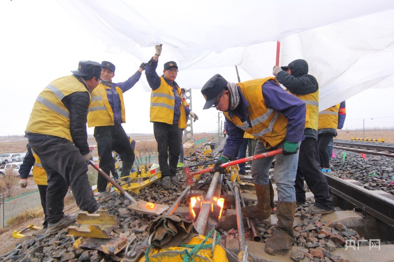 但這還不夠,為了讓鋼軌充分舒放“筋骨”、釋放應(yīng)力,職工們還必須切開(kāi)鋼軌,緊接著進(jìn)行焊聯(lián),這項(xiàng)工作由德令哈重點(diǎn)維修車(chē)間負(fù)責(zé)。車(chē)間主任郭鋒亮一邊組織職工開(kāi)動(dòng)切割機(jī)實(shí)施精準(zhǔn)切割,一邊組織職工架起焊鍋?;鸹w舞,火苗竄升,作業(yè)人員的對(duì)比服在火光和風(fēng)雪的映襯下顯得更加熠熠生輝。最終,做完“伸展運(yùn)動(dòng)”的鋼軌在焊劑的作用下重新融合在了一起,經(jīng)打磨后再難區(qū)分彼此。