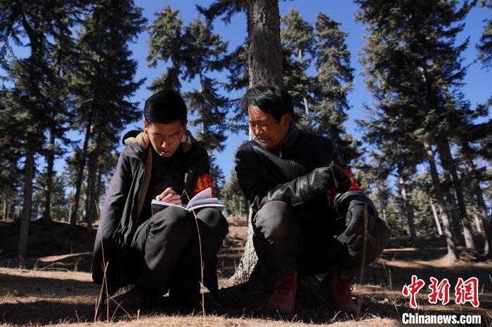 “每天和同事至少要巡護(hù)兩趟。早些年從管護(hù)站到林場只能靠步行,早晨天不亮就出發(fā)?,F(xiàn)在,每次巡邏都能和會(huì)騎摩托車的同事一起,方便多了?!鄙=芗友刂暄训男÷?,往林場深處走去,巡護(hù)中,看見一棵樹體上有大片樹皮開裂,桑杰加立即上前檢查是否有凍害、蟲口等。