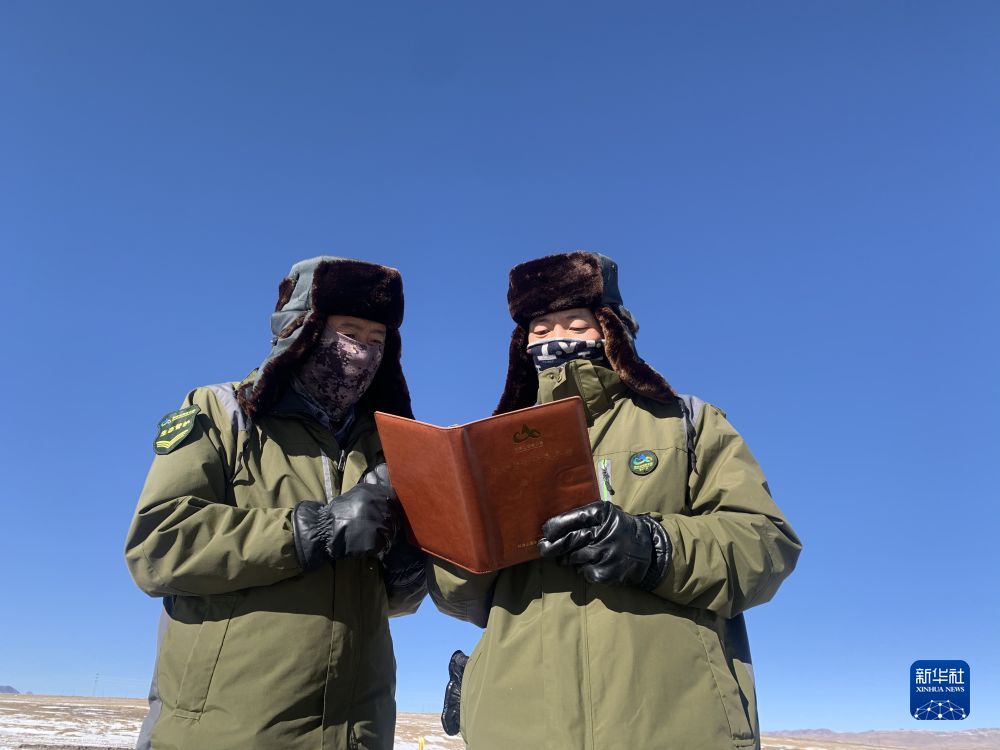 2021年12月3日,祁連山國家公園沙龍灘管護(hù)站巡護(hù)隊隊長楊有財(左)在巡護(hù)監(jiān)測記錄手冊上記錄。新華社 李琳海 攝