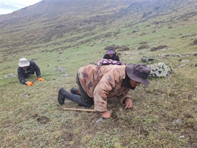 貢呷洛珠穿著棉襖,腿上綁著橡膠護膝,雙膝跪在草地上,俯身搜尋。與他結(jié)伴的是村里的恩珠夫妻倆,他們也趴著身子,不放過眼前的每一寸草地。