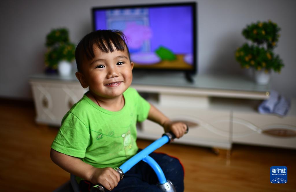 在青海省黃南藏族自治州河南蒙古族自治縣易地扶貧搬遷安置小區(qū)幸福家園,智后茂村牧民旦卻卓瑪的兒子羅藏智華在家中玩耍(2018年6月13日攝)。新華社記者 張宏祥 攝