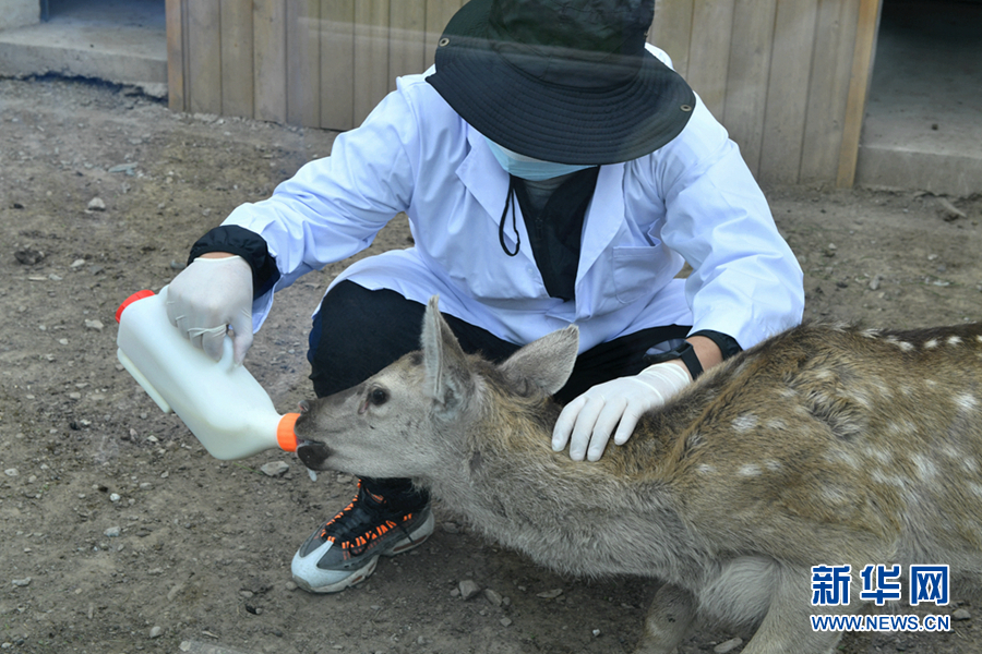 在祁連山國家公園青海片區(qū)野生動物救護繁育中心內,工作人員正在給馬鹿喂奶。新華網(wǎng) 卡婭梅朵 攝