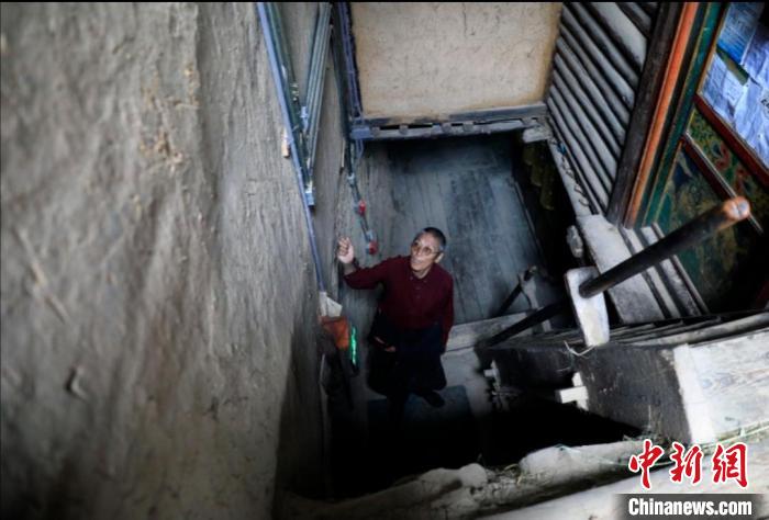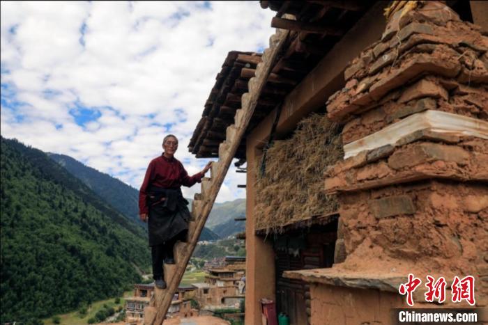 76歲的碉房主人洛吾王爾甲正在攀爬碉樓。王磊 攝