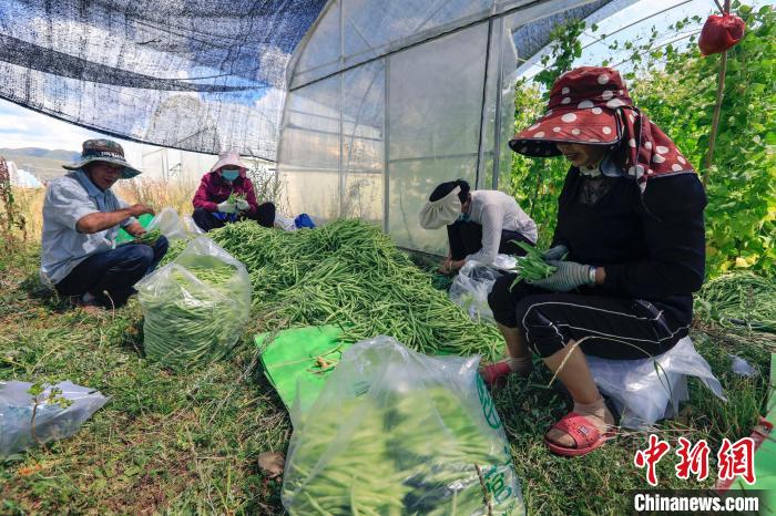 八月中旬,在四川省阿壩藏族羌族自治州壤塘縣的熱布卡蔬菜基地,五月種植的第一批四季豆(學名菜豆,下同)正值豐收。50歲的陳老會年初從云南來到四川壤塘工作,她和工友們將剛采摘的四季豆篩選裝袋,近五十斤重的包裝袋整齊鋪滿地面。“我們下午采摘的蔬菜,第二天早上就能出現(xiàn)在成都的市場上?!彼^也不抬地忙著手中的活。