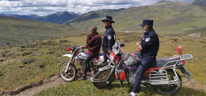 禾尼鄉(xiāng)派出所接到求助后,立即安排在附近開展工作的草原騎警隊警力寧紅玉、澤仁公布、格絨降措帶領(lǐng)熟悉附近地形的派出所群防群治義警隊員丁真稱乃,騎摩托車趕赴現(xiàn)場。期間,草原騎警隊協(xié)調(diào)附近牧民租借3臺摩托車前往迷路地方尋找,因迷路地點在海拔4800多米的高山,草原騎警隊翻山越嶺,經(jīng)過3個多小時的尋找,與迷路人員家屬在一山坳處找到德洛。家屬滿含熱淚的看著草原騎警隊隊員說,“麻煩你們了,謝謝你們了,你們辛苦了?!?/p>