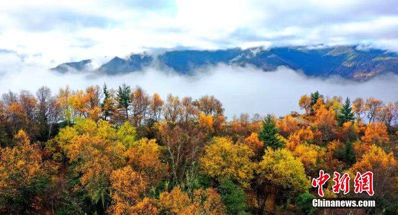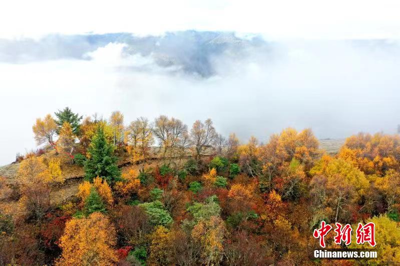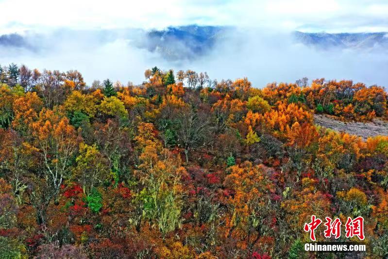 深秋時節(jié),四川馬爾康市馬爾康鎮(zhèn)阿底村賽馬山迎來彩林觀賞的最佳季節(jié)。放眼望去,海拔3500米的賽馬山上彩林連綿延伸至茫茫云海,遠方雪山四面環(huán)繞,宛如仙境一般。阿壩州文體旅游局供圖