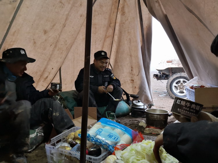 參與巡查的警員在帳篷中吃飯。