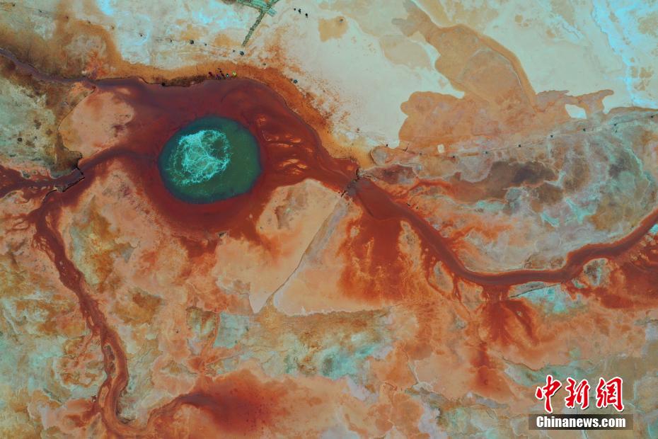 艾肯泉位于青海省海西蒙古族藏族自治州茫崖市花土溝鎮(zhèn)。艾肯”蒙語意為“可怕”,由于含硫量過高,泉眼周圍飛鳥野獸不敢靠近,泉水流經(jīng)的地方寸草不生。從空中俯瞰,泉眼與噴涌出的泉水及周圍土地上深紅色環(huán)帶狀的沉淀物,組成了一個奇特的瞳孔造型,仿佛一只鑲嵌在大地上的眼睛,因此被稱為“惡魔之眼”。圖為航拍茫崖市艾肯泉。