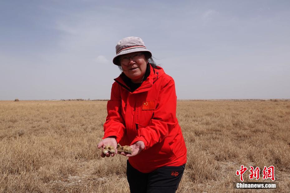 新建觀測(cè)站勘查選址過程中,第二次青藏科考中科院空天院分隊(duì)領(lǐng)隊(duì)賈立研究員展示介紹濕地中凝結(jié)的鹽塊。孫自法 攝
