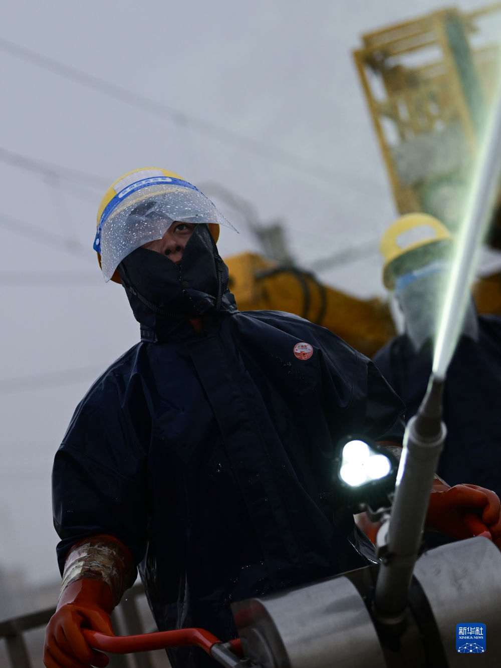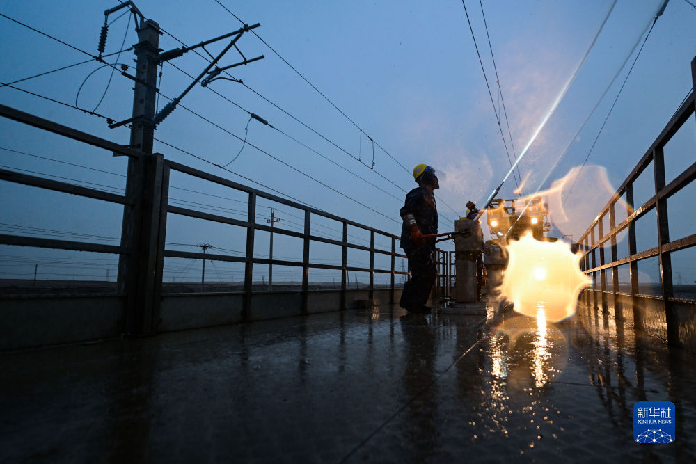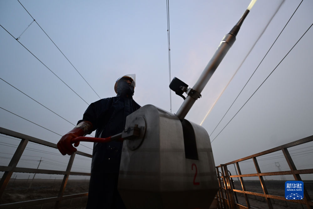 4月20日,中國(guó)鐵路青藏集團(tuán)有限公司西寧供電段格爾木大修車間大修網(wǎng)工區(qū)檢修工王瑞豪使用高壓沖洗水槍對(duì)絕緣子設(shè)備進(jìn)行清洗。新華社記者 張龍 攝