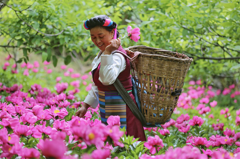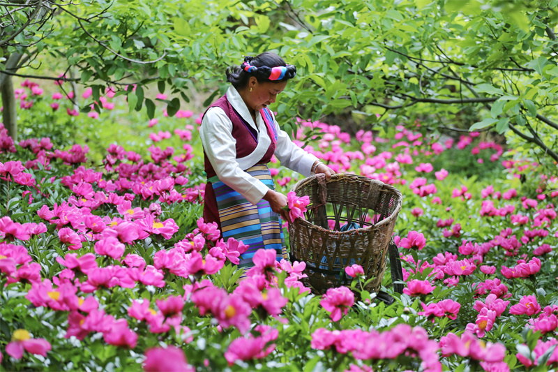 五月,正是芍藥花開的最佳時節(jié)。在維西縣塔城鎮(zhèn)其宗村村民楊小花家的芍藥地中,大片的芍藥花競相開放,花團錦簇、花香四溢,楊小花正在田間忙碌著采摘芍藥花朵,芍藥花及根采挖后都可出售,在增加收入的同時也成為田間地頭一道美麗的風(fēng)景線。