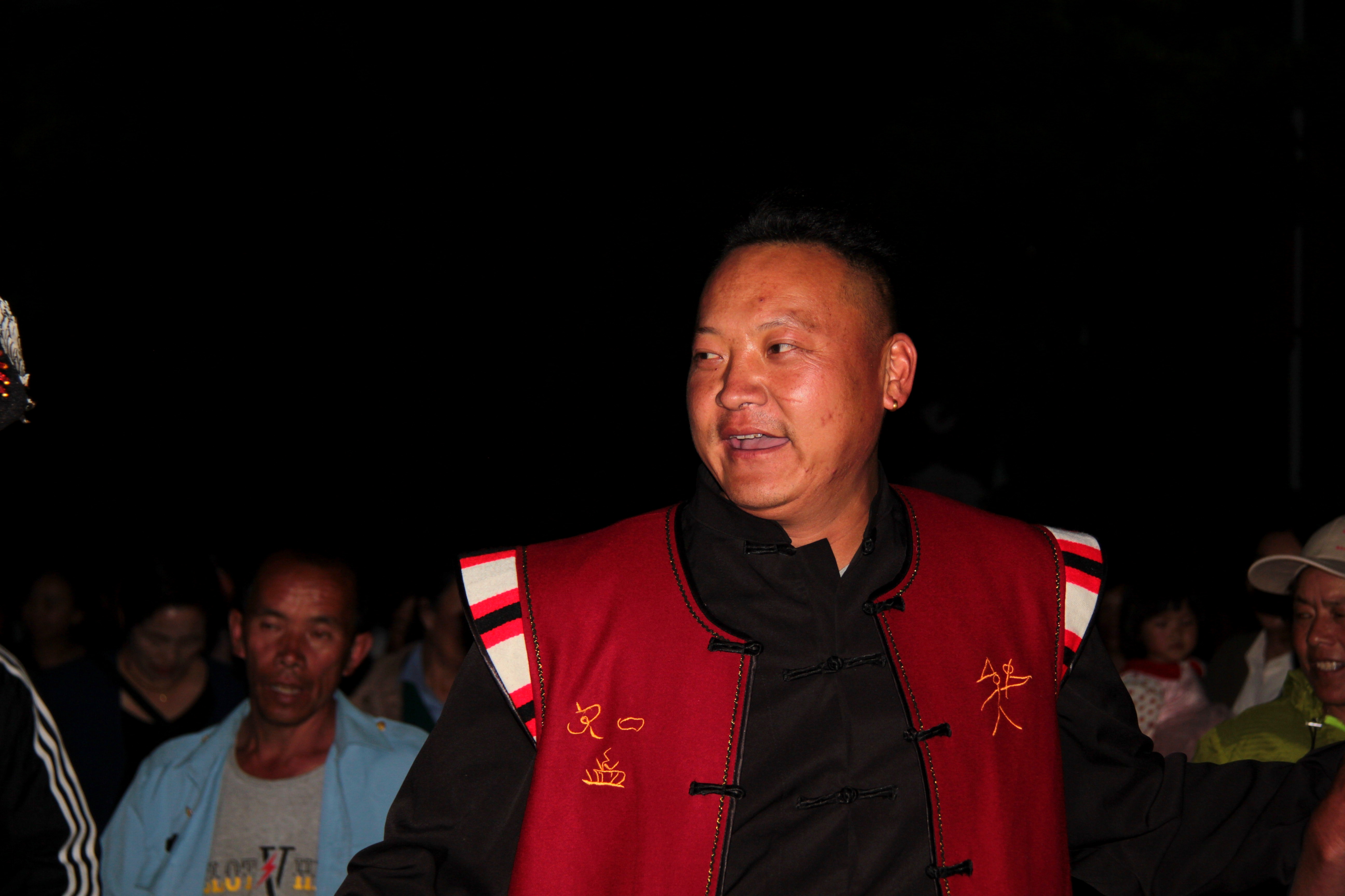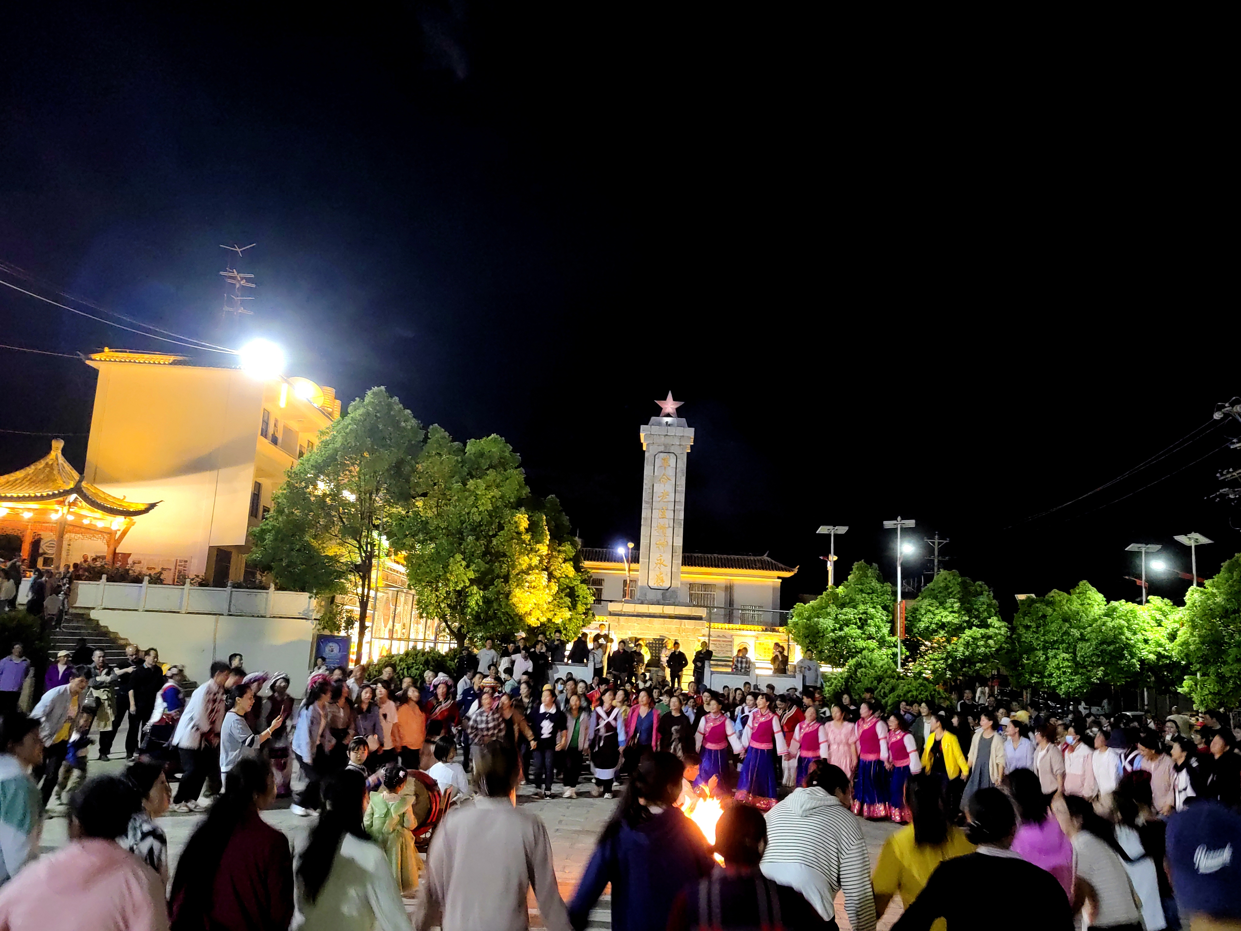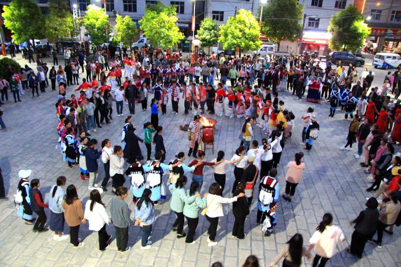 打跳開始了,不斷有圍觀群眾參與到打跳當(dāng)中,打跳選手手牽手把篝火圍了三四圈,篝火的映照下,大家臉上的笑容又燦爛了幾分。打跳歌曲從勁爆葫蘆絲換到納西三部曲又換到大蠻調(diào),換了無數(shù)首,而參與群眾仿佛不知疲倦一直激情打跳著,現(xiàn)場(chǎng)非常火熱。