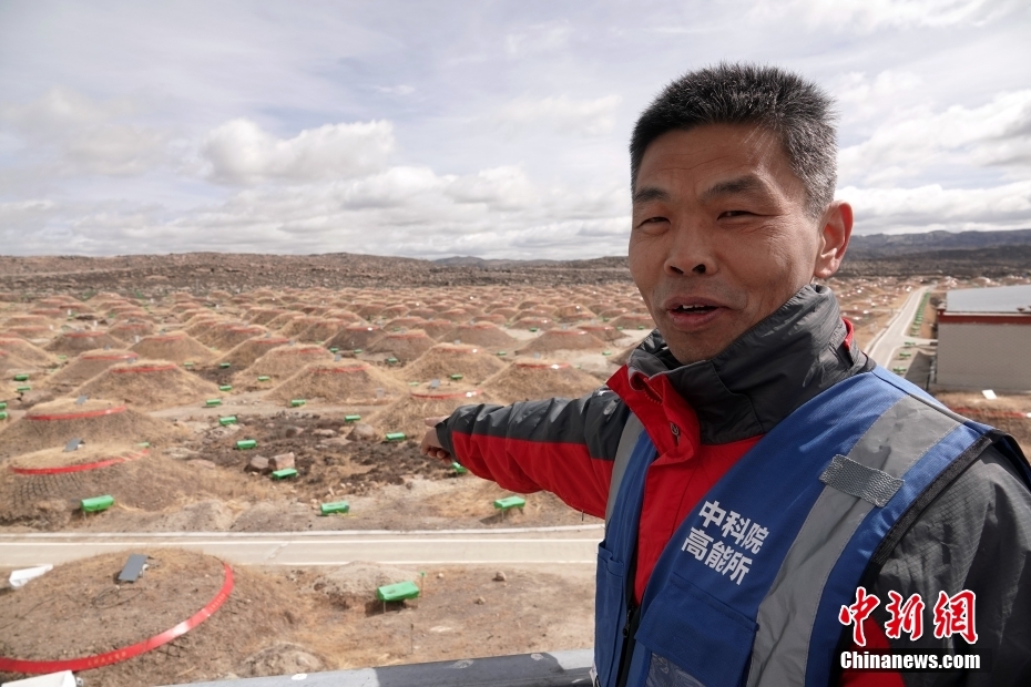 圖為國家驗(yàn)收之前的4月22日,四川稻城海子山,“拉索”總工藝師、中國科學(xué)院高能物理研究所研究員何會(huì)海介紹大科學(xué)裝置建設(shè)相關(guān)情況。中新社記者 孫自法 攝
