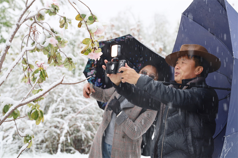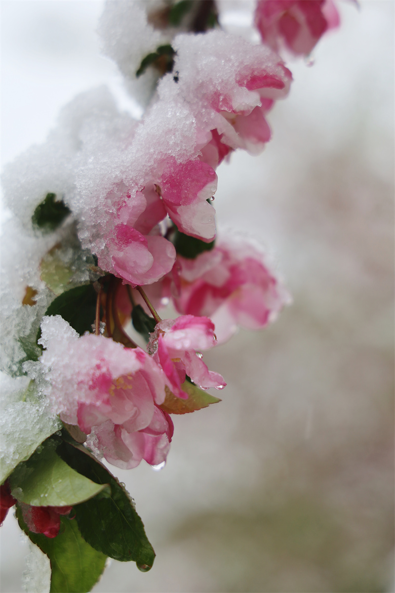 花映雪,雪融花,雪水晶瑩,花瓣嬌艷,攝影愛好者在大雪紛飛中記錄香格里拉的詩情畫意。