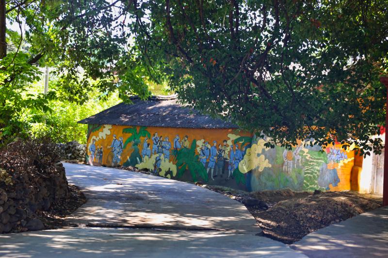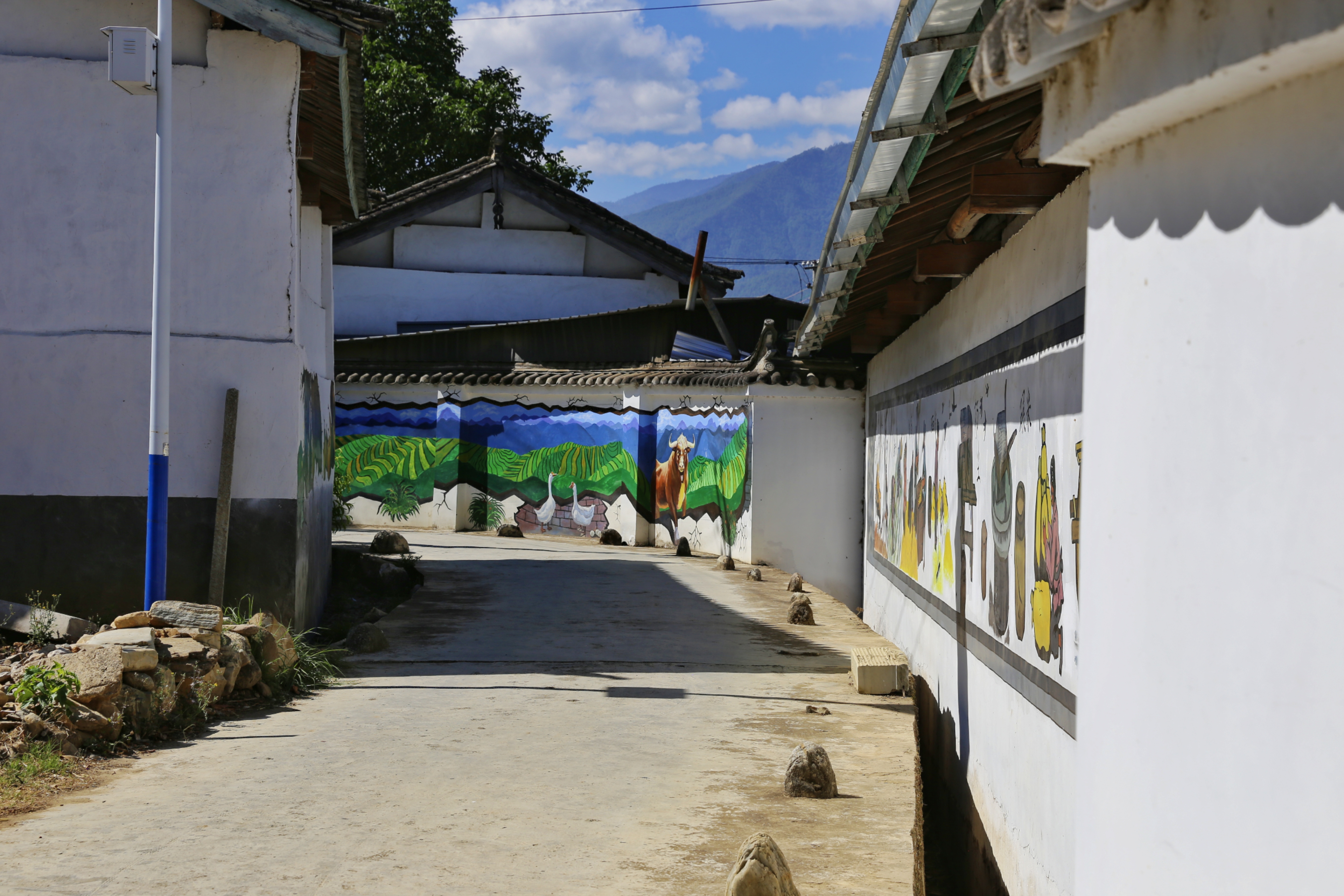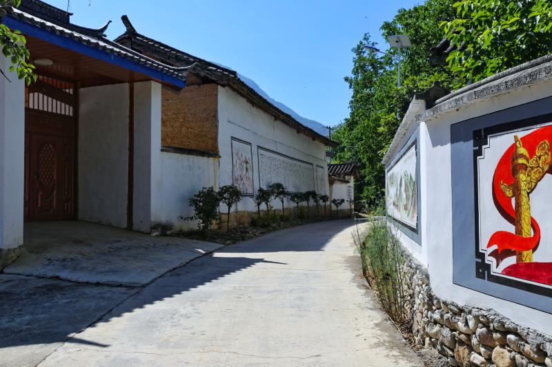 初夏時(shí)節(jié),走進(jìn)香格里拉市金江鎮(zhèn)吾竹村堆滿一組,映入眼簾的是遠(yuǎn)山青黛、碧水田園,房前屋后古樹(shù)紅花相映,鄉(xiāng)間小道兩側(cè)果樹(shù)成蔭,一幅幅包含該村文化歷史的彩繪躍然墻上,漫步其間好不愜意。