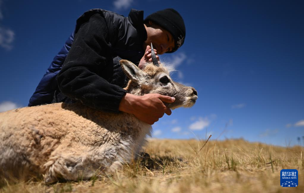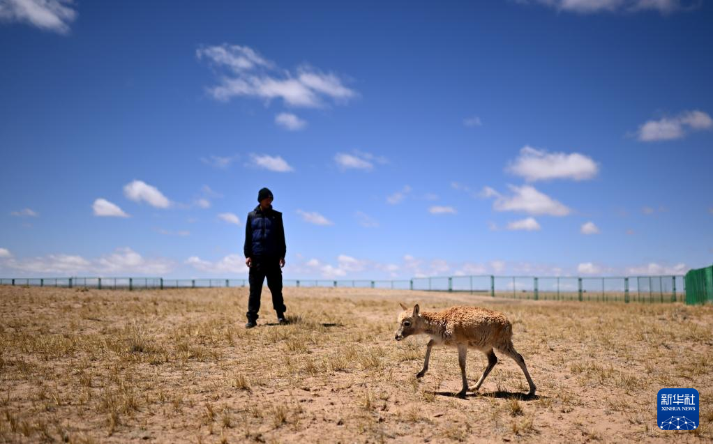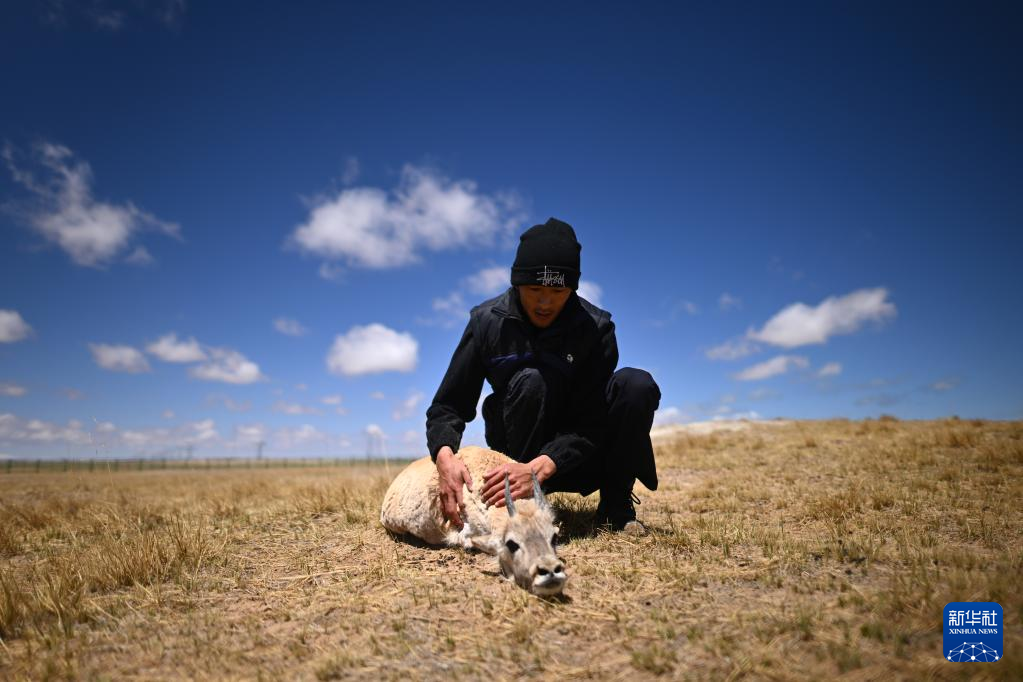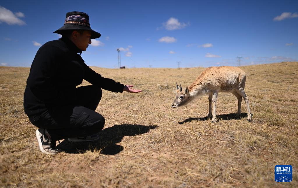在可可西里國家級自然保護區(qū)索南達杰保護站,巡山隊員扎西桑周在野生動物救助中心內(nèi)與一只被救助的小藏羚羊互動(5月30日攝)?!⌒氯A社記者 張宏祥 攝