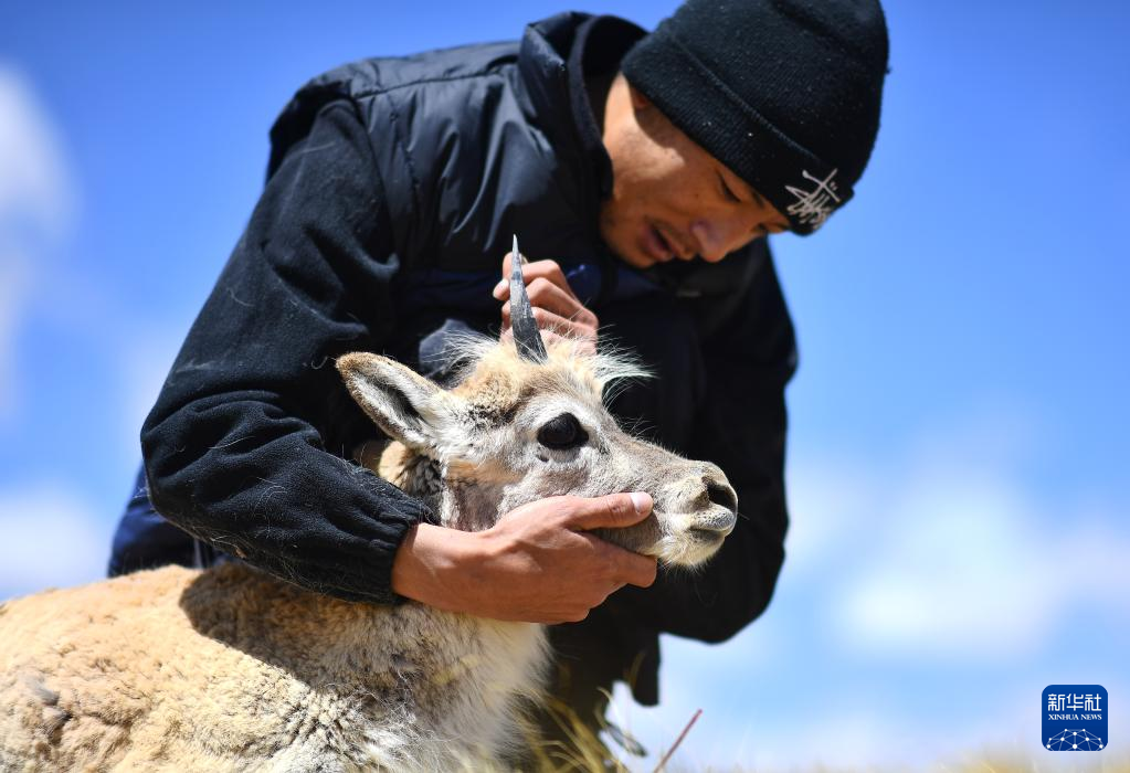 在可可西里國家級自然保護區(qū)索南達杰保護站,巡山隊員才文多杰在野生動物救助中心查看被救助的藏羚羊身體狀況(5月30日攝)?!⌒氯A社記者 張宏祥 攝