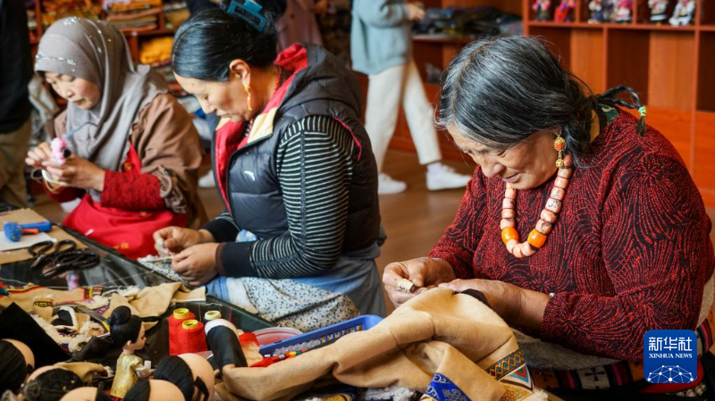 在若爾蓋縣唐克鎮(zhèn)白河社區(qū),“吉祥娃娃”手工社的社員們?cè)谥谱鳌凹橥尥蕖?。新華社記者 尚文意 攝