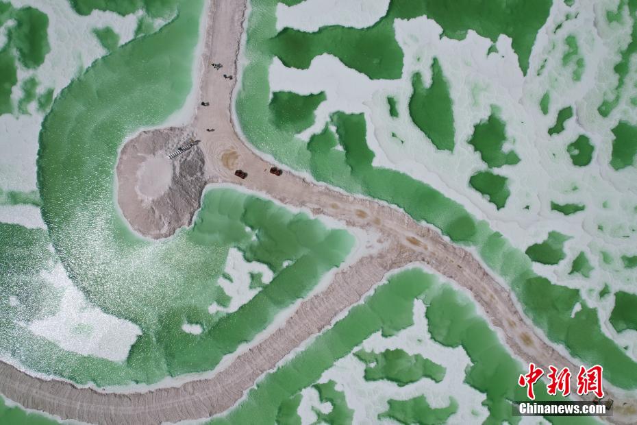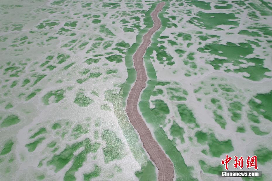 8月15日,航拍地處青海省海西州茫崖市的翡翠湖。翡翠湖是一個人工鹽湖,田字狀的湖水呈現出青翠的色彩。[詳細]