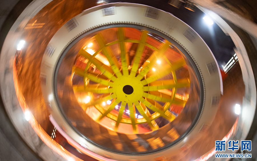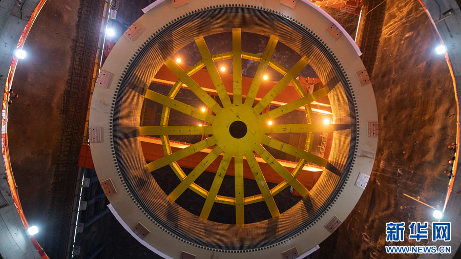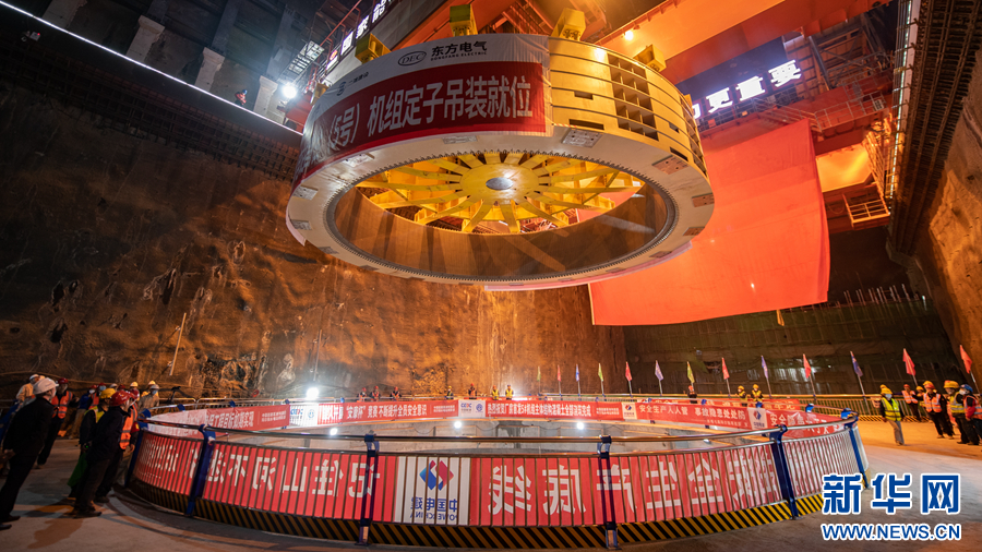6月30日,瑪爾擋水電站地下廠房內(nèi),工作人員正在進(jìn)行首臺機(jī)組定子吊裝作業(yè)。新華網(wǎng) 潘彬彬 攝