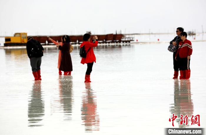 圖為茶卡鹽湖景區(qū)內,游客合影留念。 薛蒂 攝