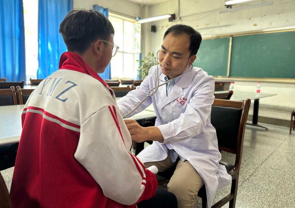 教學(xué)樓里,10名北京協(xié)和醫(yī)院的專家兩人一組,為200名學(xué)生進(jìn)行骨科、眼科、兒科綜合檢查?!翱凑胺?。佩戴眼鏡后一定要按期復(fù)查。課間可以摘下眼鏡按摩一下,避免過度用眼?!北本﹨f(xié)和醫(yī)院眼科專家李冰一邊拿著檢眼鏡細(xì)心檢查,一邊耐心地講解用眼知識(shí)。