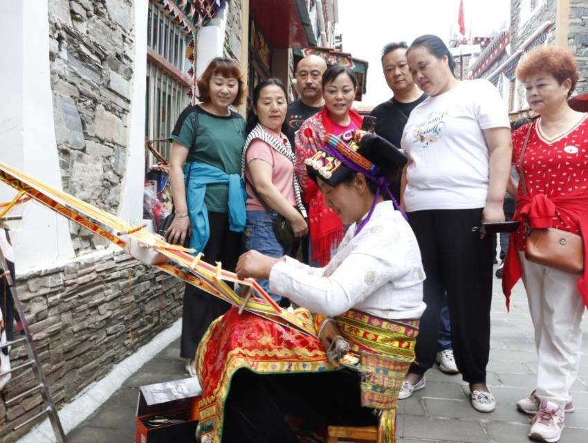 在理縣古爾溝鎮(zhèn)丘地村,54歲的藏族阿媽澤朗斯基端坐家門前,動(dòng)作嫻熟地操作著傳統(tǒng)腰機(jī),編織一款藏式花腰帶。只見(jiàn)她靈巧的雙手來(lái)回推拉木梭,不時(shí)變換著經(jīng)線,不一會(huì)兒,五彩的絲線就化為明艷動(dòng)人的吉祥紋樣,在織布上綻放開來(lái)。