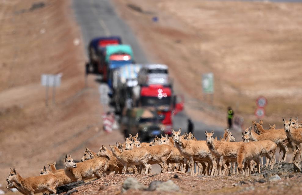5月29日,在青海可可西里,一群雌性待產(chǎn)藏羚羊通過青藏公路。新華社記者 張宏祥 攝