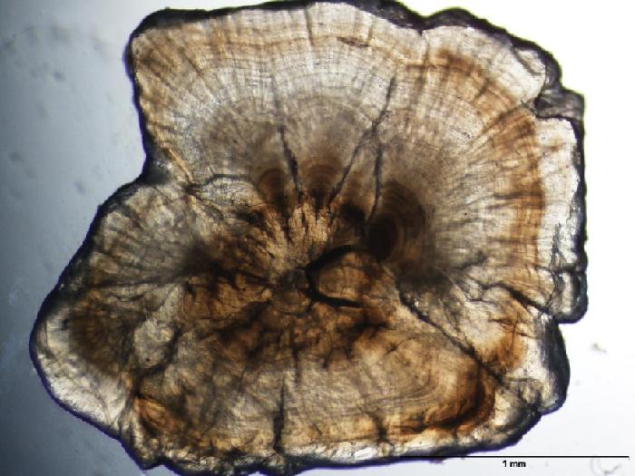 這是顯微鏡下的魚類耳石剖面圖。(受訪者供圖)