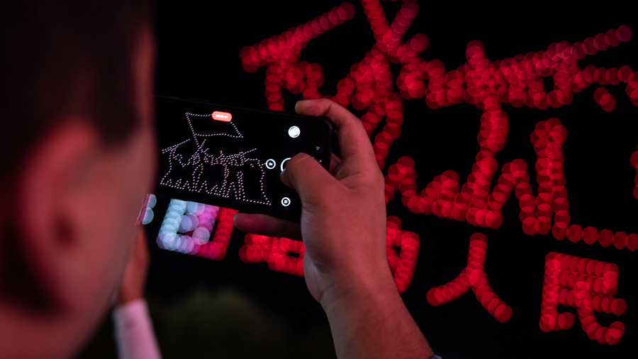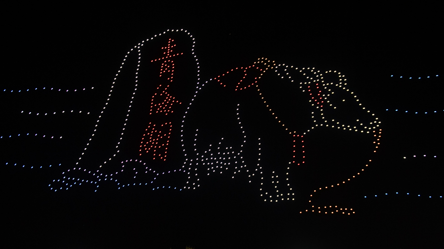 7月31日,慶祝青海省海南藏族自治州成立70周年藏族服飾藝術(shù)嘉年華迎賓晚會(huì)現(xiàn)場(chǎng)的無(wú)人機(jī)編隊(duì)表演。