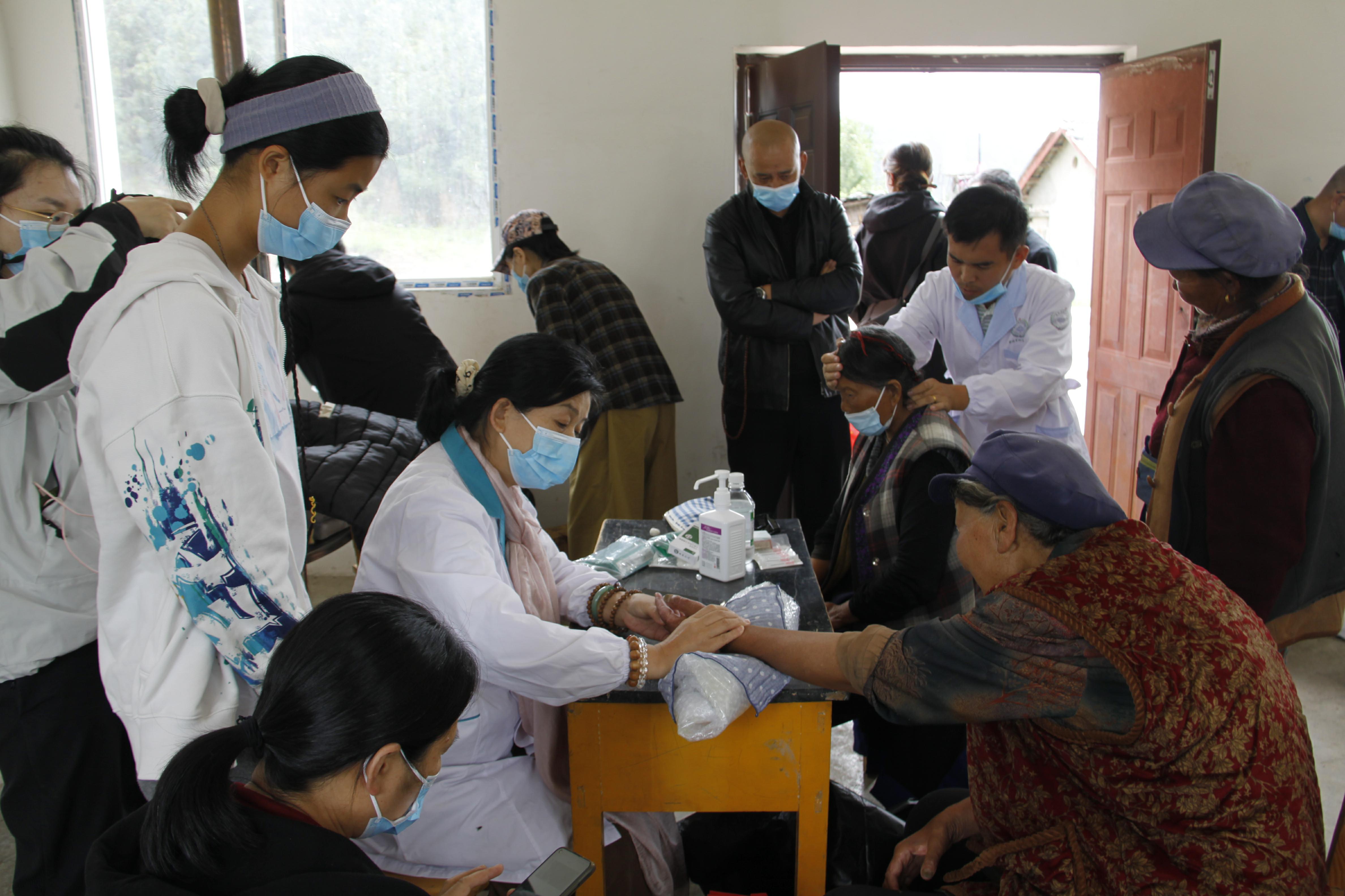 醫(yī)護人員為村民開展健康義診服務。服務包括:免費量血壓、測血糖,診脈、按摩、針灸,為老年人提供中醫(yī)適宜技術;詢問既往病史,了解近期用藥情況,為村民免費發(fā)放常用藥品;開展健康教育宣傳,發(fā)放藏漢雙語《百草箱女性衛(wèi)生健康手冊(2023年版)》等讀物,普及衛(wèi)生健康常識。