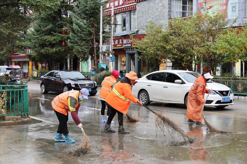 為盡快恢復(fù)城區(qū)潔凈容貌,香格里拉市和祥環(huán)??萍加邢挢?zé)任公司立即組織環(huán)衛(wèi)工人30名,抽調(diào)高壓水車2輛、掃地車4輛,積極開展道路清淤工作,同時(shí)對下水道水口周邊的樹枝、雜物等進(jìn)行清理清運(yùn)。經(jīng)過近五小時(shí)的連續(xù)作業(yè),成功恢復(fù)道路暢通整潔。
