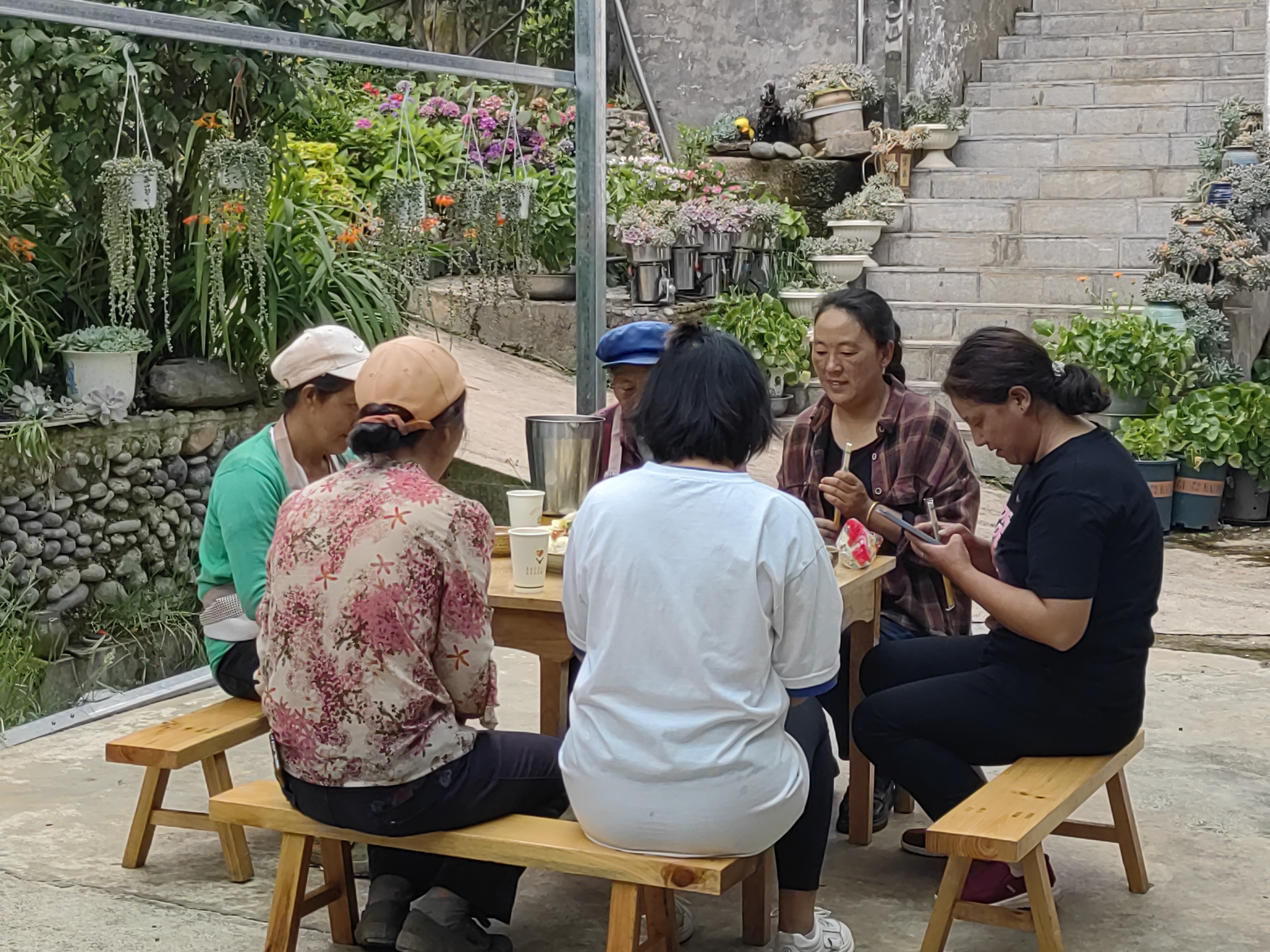 村口,一個(gè)名叫“成姐農(nóng)家樂”的小院里歡聲笑語,熱鬧非凡?!斑@是今天剛挖的洋芋和新鮮采摘的瓜,待會(huì)就給客人做一道當(dāng)?shù)氐奶厣恕瞎涎笥??!薄盁豕瞎涎笥蟮臅r(shí)候,再做個(gè)鍋邊粑粑,這樣的農(nóng)家味道客人肯定喜歡?!痹谵r(nóng)家樂里忙碌的姐妹們邊洗菜邊討論著當(dāng)天的菜品。