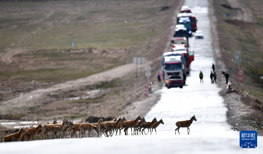 一群待產雌性藏羚羊正在通過青藏公路前往可可西里卓乃湖產仔(5月29日攝)。新華社記者 張宏祥 攝