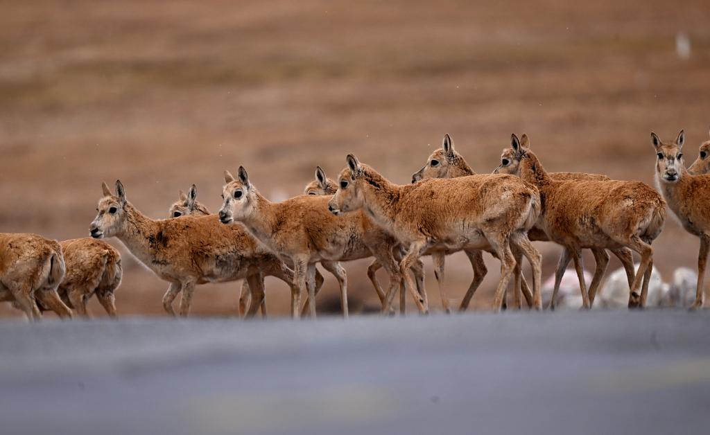 一群待產雌性藏羚羊在通過青藏公路前往可可西里卓乃湖產仔(5月28日攝)。新華社記者 張宏祥 攝