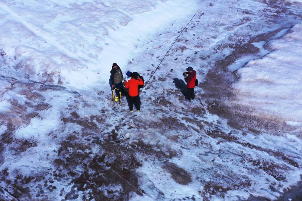 “這是我們第二次登上格拉丹東雪山主峰冰川,在去年測量的區(qū)域開展了4條測量線的雷達探測?!倍跨f,去年測量區(qū)域冰川平均厚度約12米,此次探測結果可用來比較冰川的厚薄變化,為計算冰儲量積累數(shù)據(jù)。