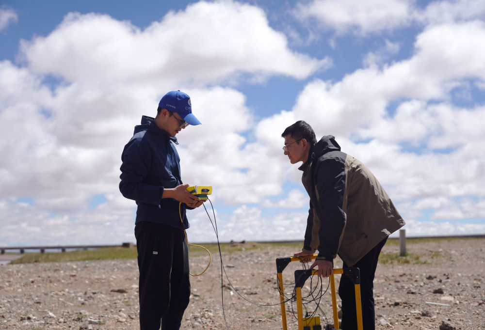 科考隊員董士琦(左)和范越在長江北源楚瑪爾河附近進行地質雷達探測(7月29日攝)。新華社記者 陳杰 攝
