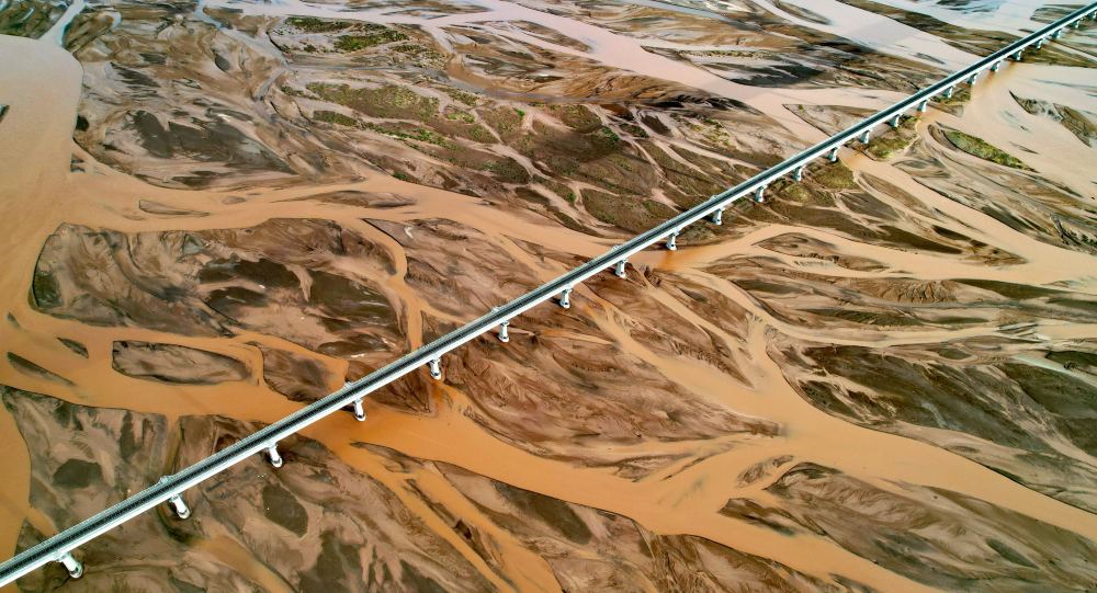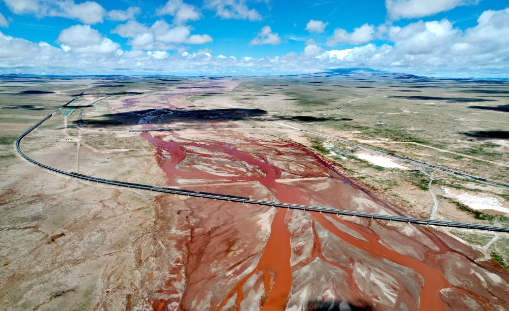 青藏鐵路通過辮狀河道的沱沱河(7月26日攝,無人機照片)。新華社記者 劉詩平 攝